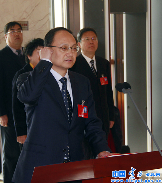 在庄严肃穆的气氛中,郑红伟宣布宪法宣誓仪式开始,奏唱中华人民共和国国歌。国歌奏唱完毕,宣誓人王钧左手抚按宪法,右手举拳,面朝国徽,宣读誓词:“我宣誓:忠于中华人民共和国宪法,维护宪法权威,履行法定职责,忠于祖国、忠于人民,恪尽职守、廉洁奉公,接受人民监督,为建设富强、民主、文明、和谐的社会主义国家努力奋斗!”